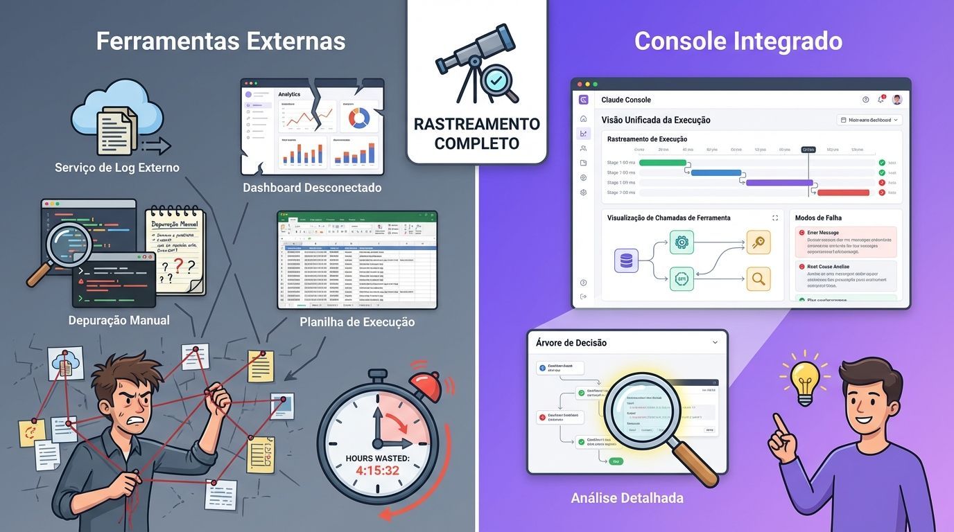 Rastreamento de sessão, análise de integração e orientação para solução de problemas estão integrados diretamente no Claude Console, para que você possa inspecionar cada chamada de ferramenta, decisão e modo de falha.