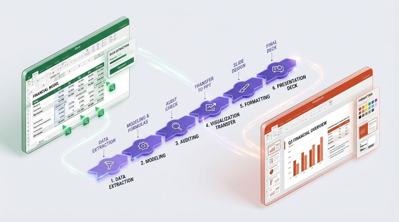Um analista financeiro pode extrair dados de empresas comparáveis de uma planilha aberta e outras fontes de dados. A partir daí, é possível construir uma tabela de trading comps no Excel, inserir o resumo de valuation no pitch deck e rascunhar o e-mail para o MD — tudo sem alternar entre abas ou re-explicar o dataset em cada etapa.