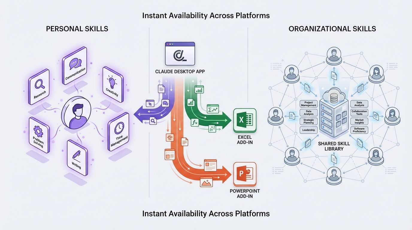 Cada skill configurada no Claude via desktop ou web app — seja pessoal ou para toda a organização — funciona nos add-ins imediatamente, da mesma forma que os conectores MCP. As skills iniciais para Excel e PowerPoint também estão disponíveis através do Financial Analysis plugin, que se instala automaticamente em ambos os add-ins.