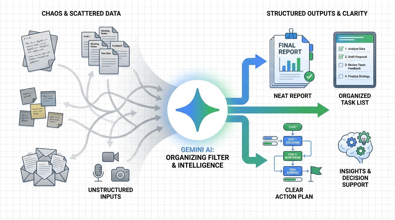 Outra aplicação comum está na organização de dados e conteúdos. O Gemini pode ser utilizado para resumir relatórios extensos, estruturar listas de tarefas ou transformar anotações dispersas em um plano de ação estruturado.