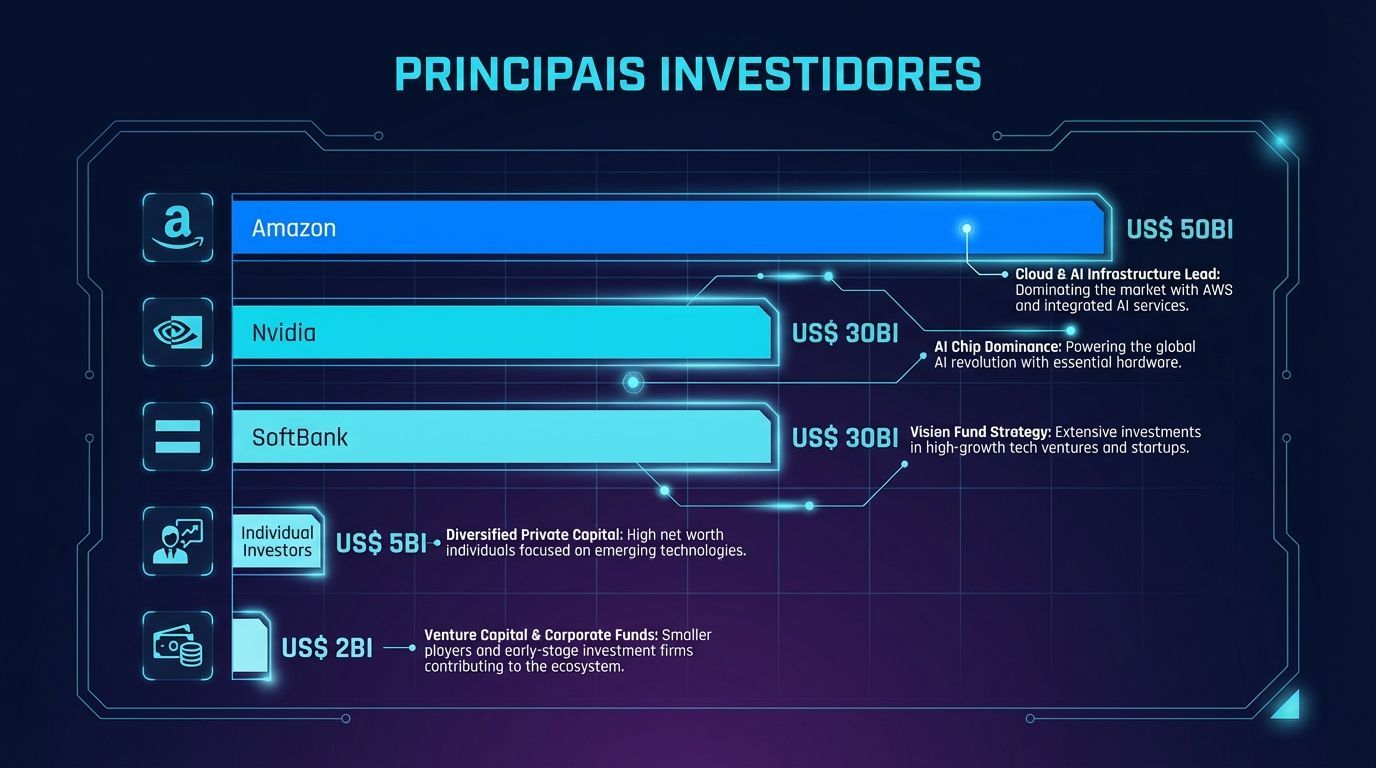 Amazon (US$ 50 bi), Nvidia (US$ 30 bi), SoftBank (US$ 30 bi), além de fundos como Andreessen Horowitz, TPG e T. Rowe Price.