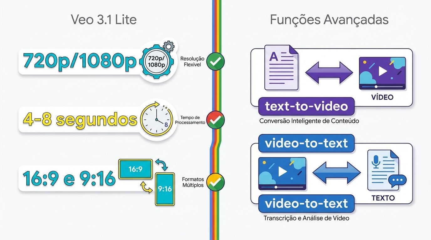 O Veo 3.1 Lite oferece recursos interessantes para criação de conteúdo em vídeo: