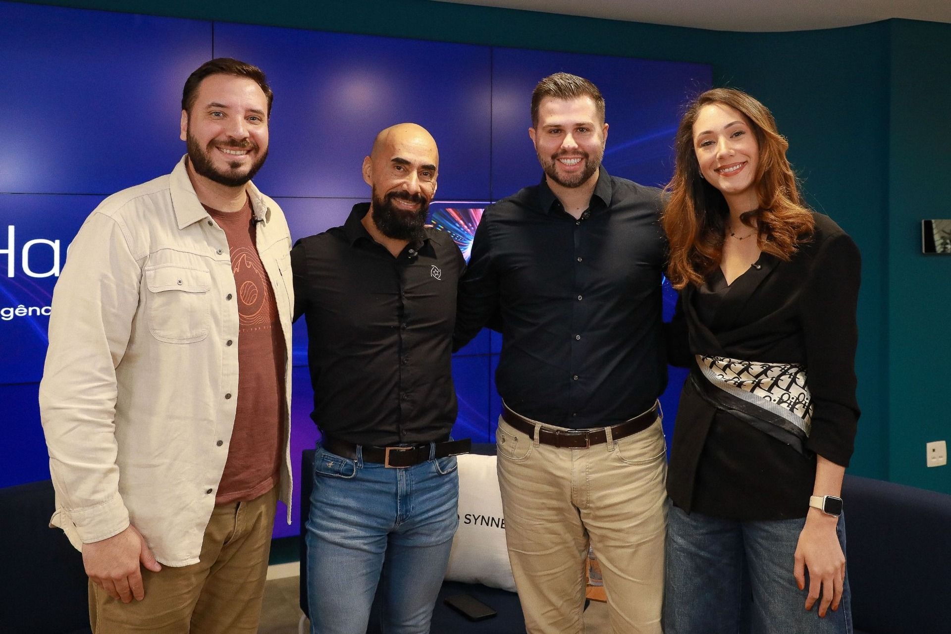 Na foto: Gabriel Lages, Diretor de Dados & IA da Hotmart e cofundador do Data Hackers; Sergio Gama, AI Solution Architect e IBM Champion 2025; Tiago Viola, Diretor de Inteligência Artificial da IBM América Latina; e Monique Femme, Líder Executiva do Data Hackers.