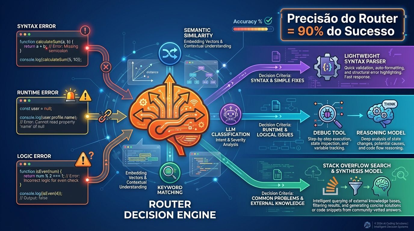 Quando um desenvolvedor submete um problema, o Router deve decidir: É um erro de sintaxe? Um erro de runtime? Um erro de lógica? Cada tipo requer tratamento diferente: