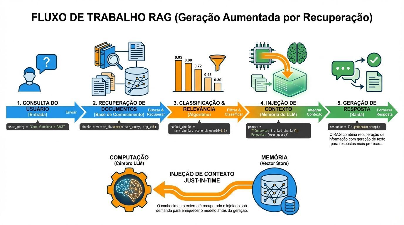 Mas arquiteturalmente, RAG representa algo mais profundo: Injeção de Contexto Just-in-Time. Pense nisso como a separação de Computação (o LLM) da Memória (o Vector Store). O modelo em si permanece estático. Ele não aprende novos fatos. Em vez disso, você troca o que está na "RAM" do modelo injetando contexto relevante em sua janela de prompt. Você não está retreinando o cérebro. Você está dando acesso às informações exatas que ele precisa, precisamente quando precisa.