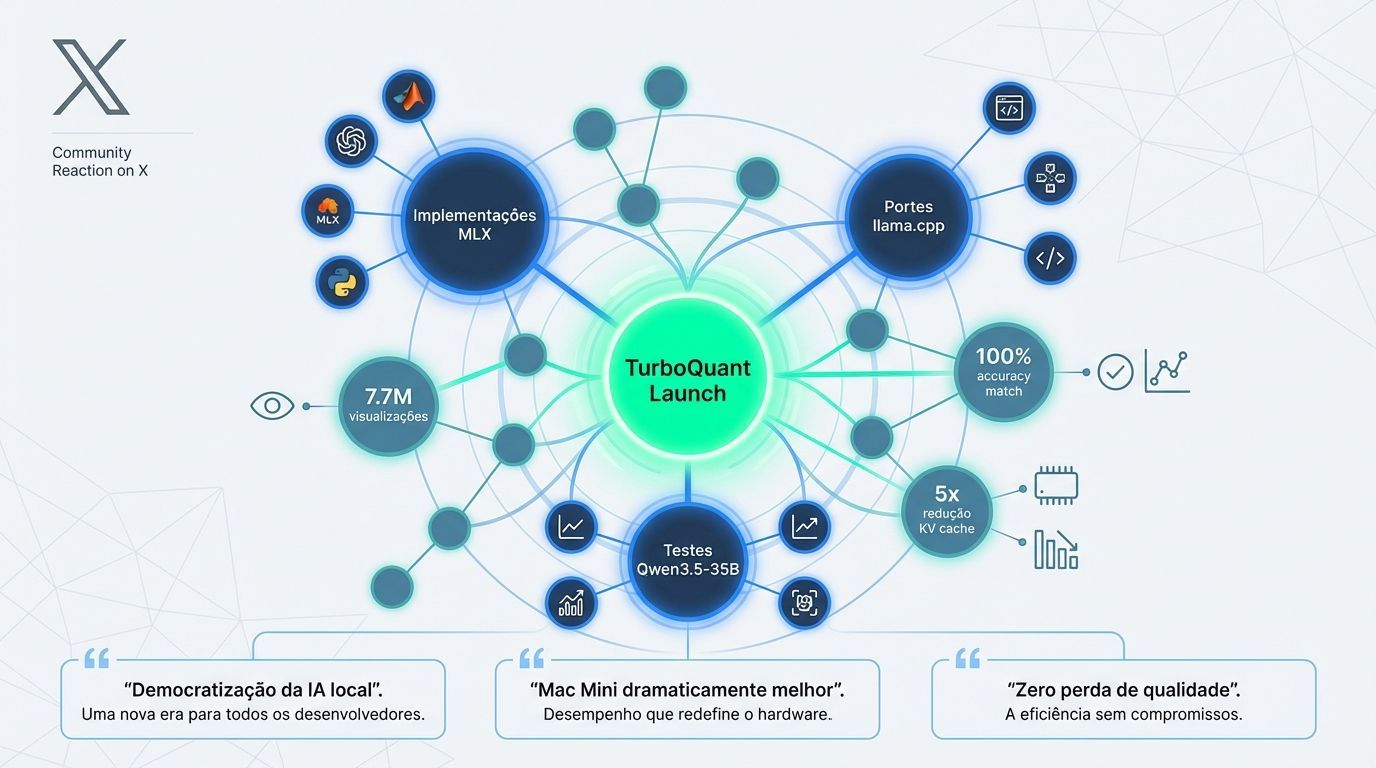 A reação no X, obtida via busca no Grok, incluiu uma mistura de admiração técnica e experimentação prática imediata. O anúncio original gerou engajamento massivo, com mais de 7,7 milhões de visualizações, sinalizando que a indústria estava faminta por uma solução para a crise de memória.